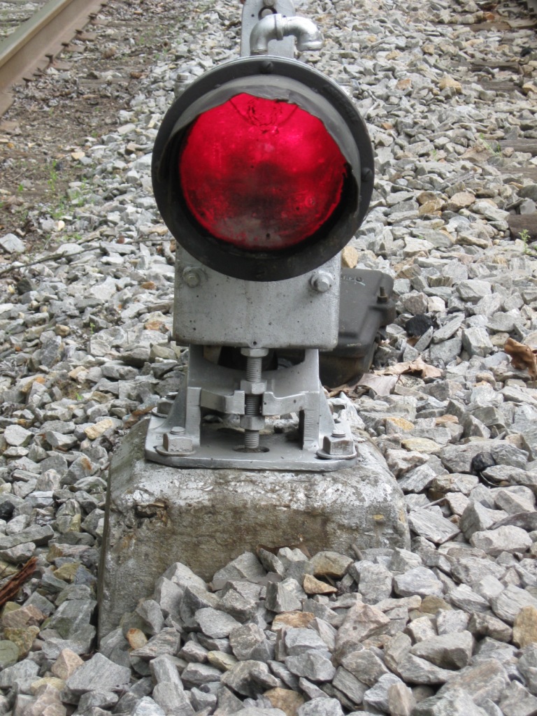As a switch was thrown from one track to the otehr, a rod supporting these lights would rotate a quarter turn. The light with red and green lights on the left was located on a switch that was on the mainline. The yellow and green light was used on another track other than the mainline, such as a spur or a yard track.