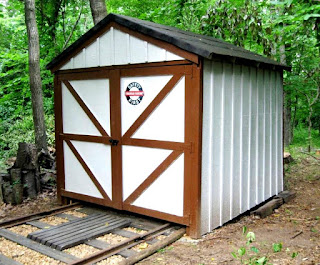 After World War II, Abert and her sisters found a second life, again as shelter for employees. The “track walkers,” or “bluff watchers” patrolled a section of track using a velocipede, but this time they were watching for rockslides or other natural dangers. In the mid 1970's, C&O officials were planned the demolition of all these shanties to lessen the amount of taxes paid. Being at the right place at the right time meant my obtaining permission from railroad to obtain Abert. In the fall of 1977 it was trucked away and moved to the author’s home. Abert was tenderly placed in the back yard, at the edge of the woods, and arranged as it would have been when it was in service. It has been cleaned and minor repairs have been made. The interior of Abert is furnished as it could have been during its latter years of service to the C&O; the correct Burnside number 5 stove, a coal scuttle with tender box, a well worn, wood chair, an old caboose desk sitting on a small table, vintage company posters on the walls, company employee timetables, note paper with a C&O company pencil nearby, red and clear kerosene lanterns to used on track patrols, paperback western novels, a sardine tin, tobacco tin, soda bottles, tins of Prince Albert tobacco, soiled work gloves, a railroad cap and coat, and sheets of galvanized metal to cover the windows in case of an air raid.